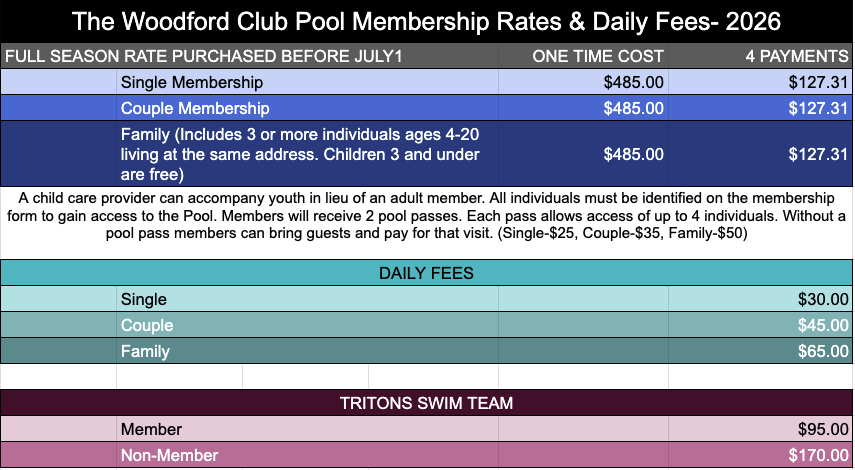 Full season rates Include unlimited use of pool during swimming season. The season runs mid-May to Labor Day weather permitting.