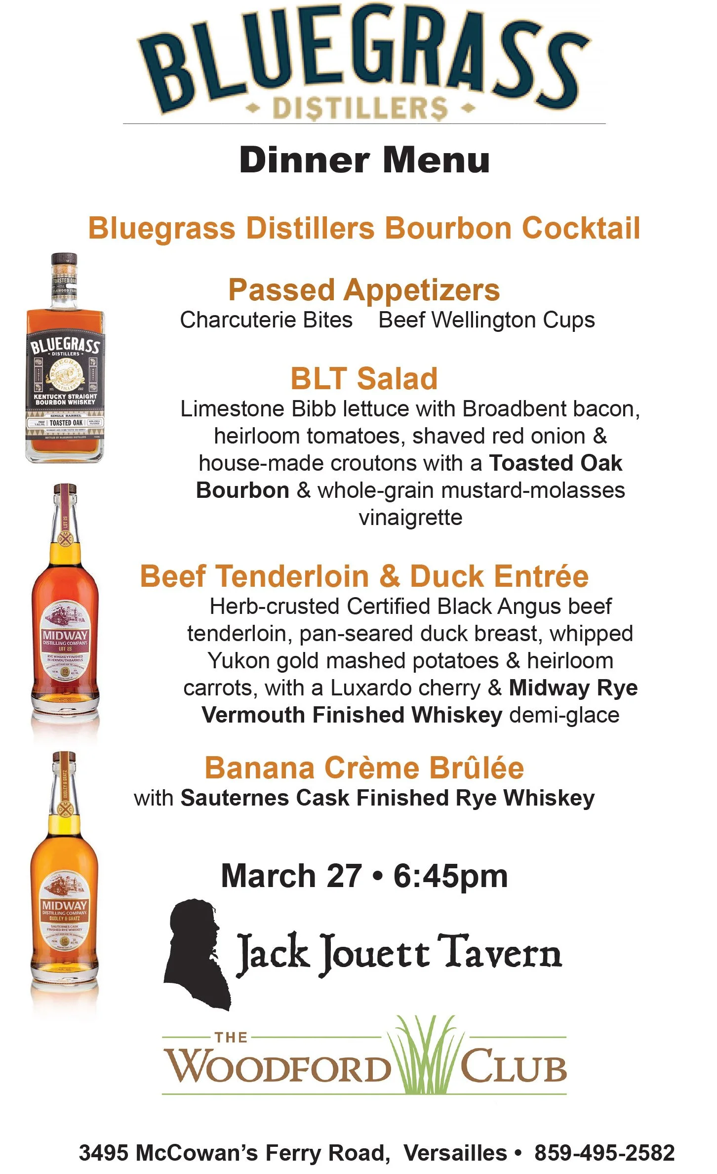 Join us for an unforgettable evening on March 27th as we embark on a one-of-a-kind dinner and bourbon pairing experience! Sam Rock, owner of Bluegrass Distillers, will guide us through an interactive tasting of their premier bourbons. Sam will dive into the story behind each bourbon and why it was chosen, while Chef Tommy will explain the thought process behind the perfect food pairing for each unique pour.